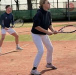 Het laatste koppel was daarmee een noviteit op tennisgebied. Ondergetekende heeft in zijn lange tenniscarrière namelijk niet eerder met een vrouw een herendubbel gespeeld!